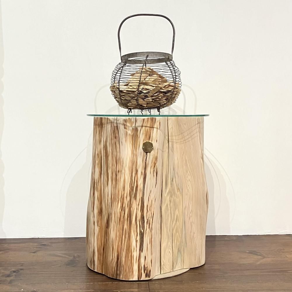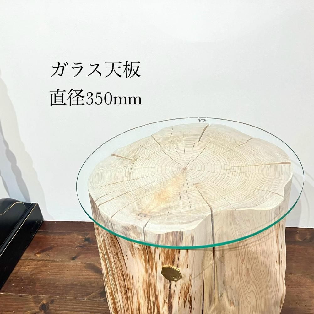 座面は少しだけ緩やかなカーブをつけ、青森ヒバの香りを楽しめる丸太のスツールです。(サイドテーブルとしてもお使いいただけるぐらい緩やかです。別途ガラス天板はこちらよりご覧いただけます。写真のガラス天板は直径350mmです。