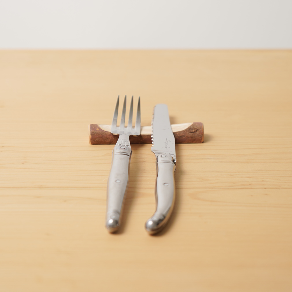 Cutlery rest with made from branches of a Hiba tree.
