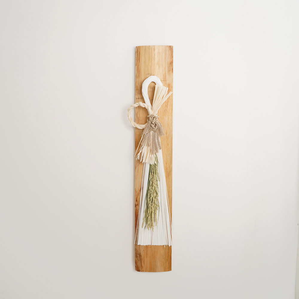 青森ヒバの辺材に、水引をベースにラフィアや稲(ドライ)の天然の植物を使っています。
