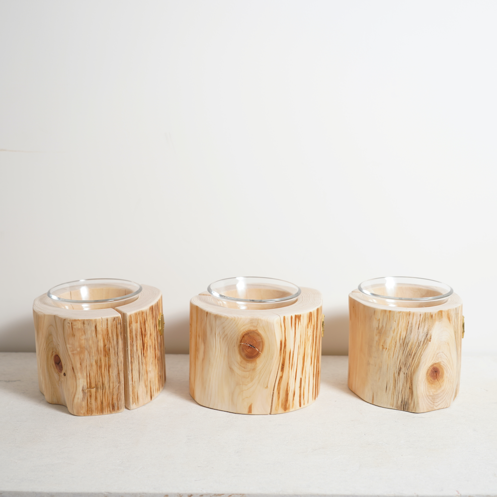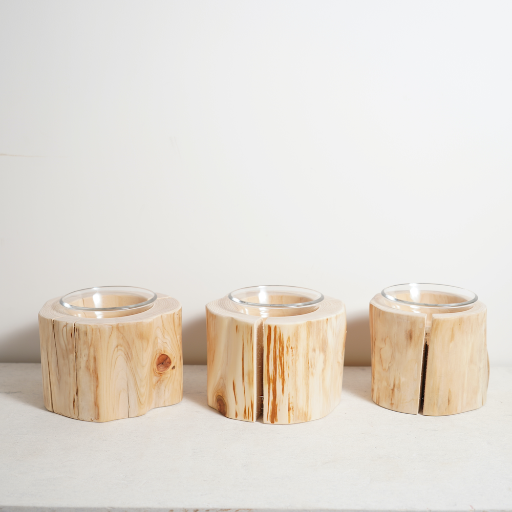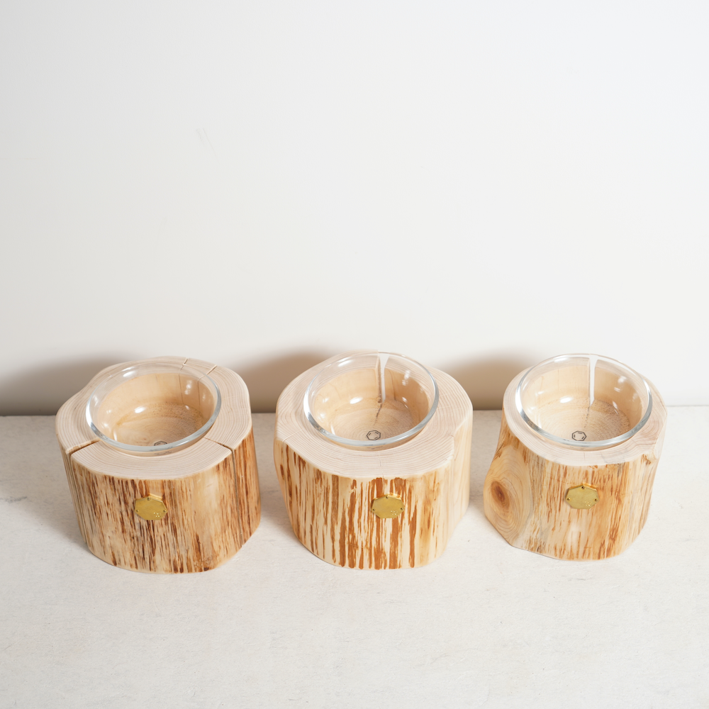 青森ヒバの丸太を使用したペット用テーブルです。(ガラスボウル1つ、滑り止め付き)