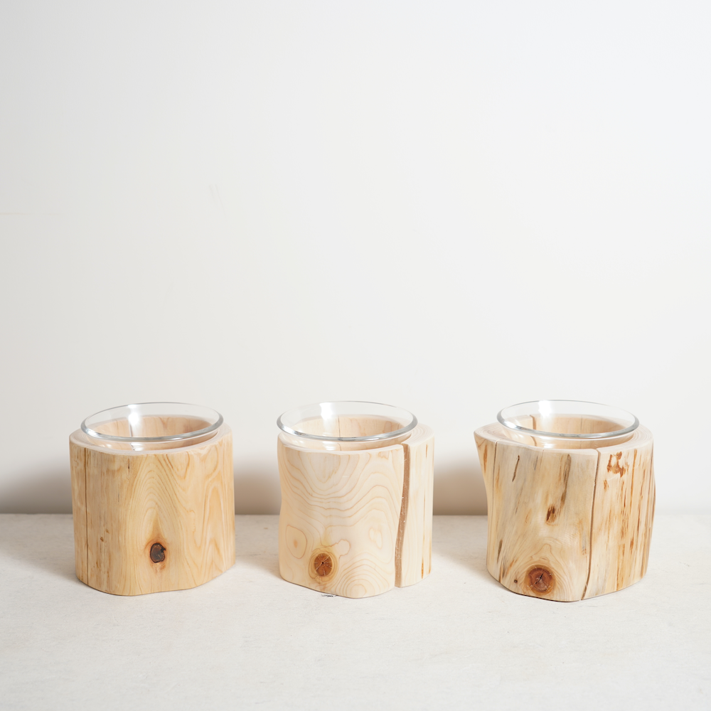 青森ヒバの丸太を使用したペット用テーブルです。(ガラスボウル1つ、滑り止め付き)
