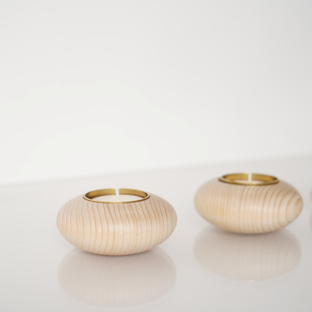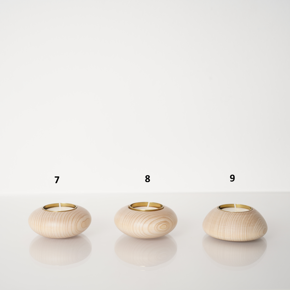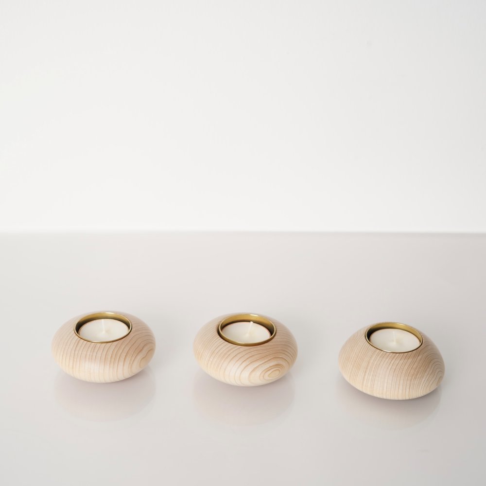 青森ヒバ精油の香りのキャンドルに火を灯すと、青森ヒバを焚いたような、暖かで優しい香りと柔らかな灯が広がります。