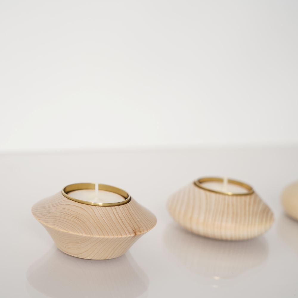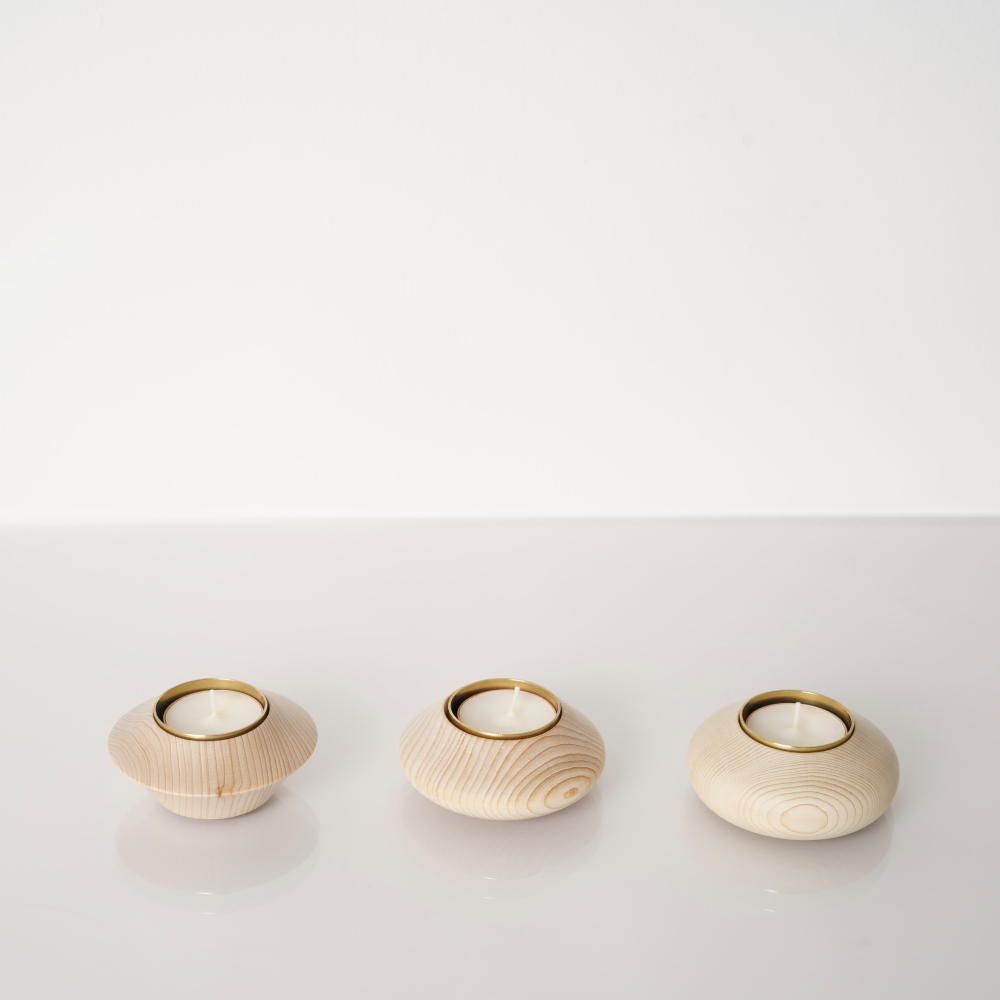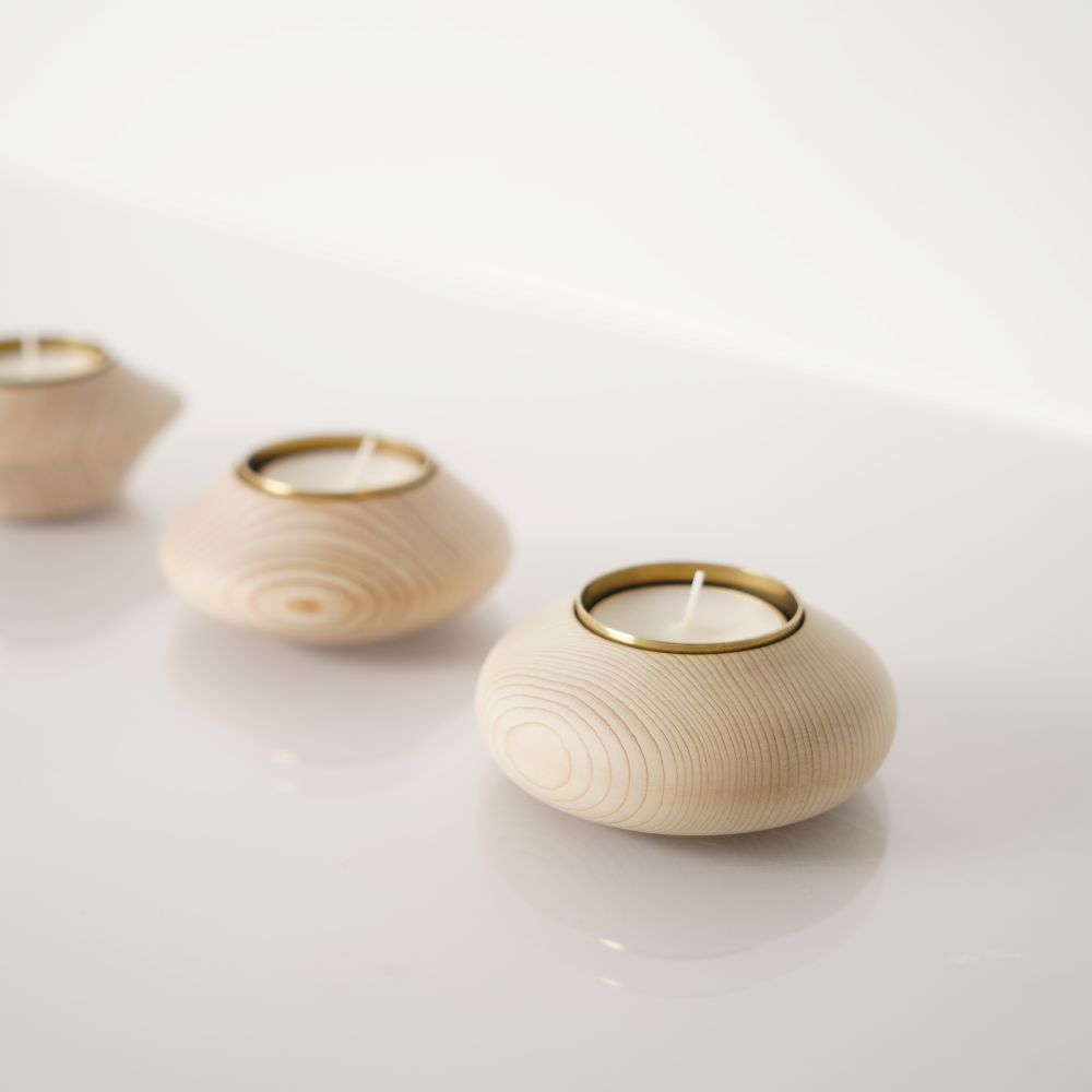 青森ヒバ精油の香りのキャンドルに火を灯すと、青森ヒバを焚いたような、暖かで優しい香りと柔らかな灯が広がります。