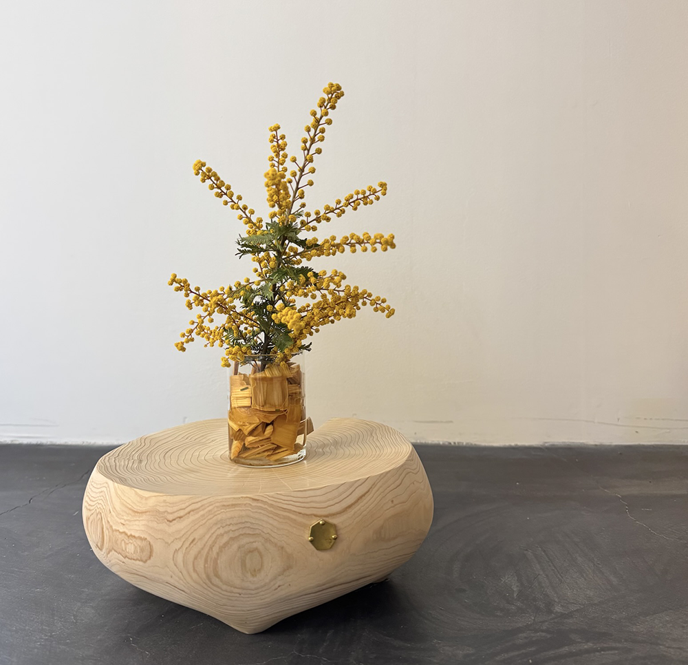 間伐材を使用し、上面にカーブをつけサイドは木目が引き立つよう丸く傾斜をつけて磨き上げました。